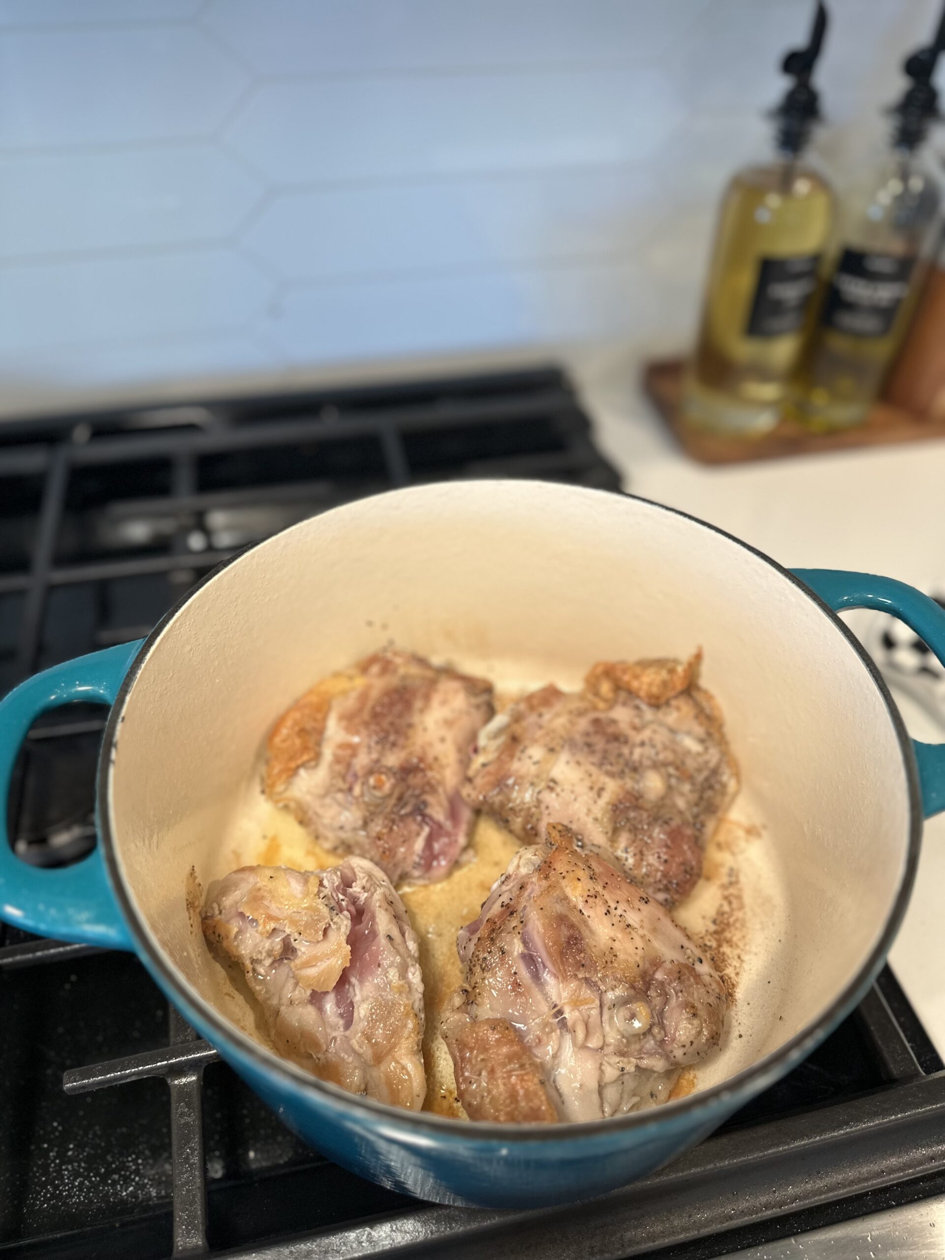 Heat 2 tablespoons olive oil in a Dutch oven over medium-high heat. Pat chicken dry, season with salt and pepper, then sear in batches for 3–4 minutes per side until browned. Transfer to a plate.