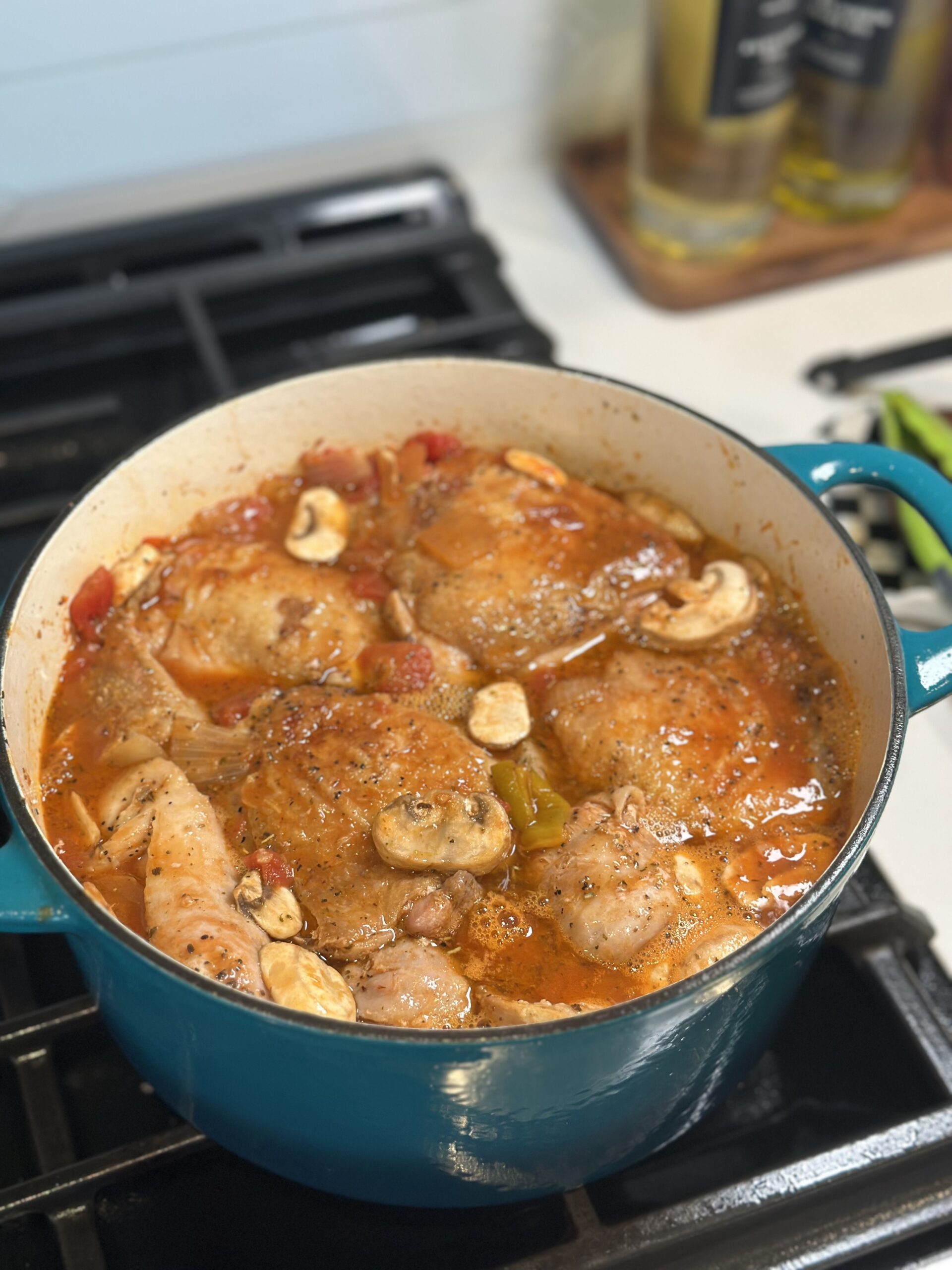 Tender chicken thighs simmered in a savory tomato-wine sauce with mushrooms, garlic, and herbs. A flavorful twist on a rustic Italian classic.