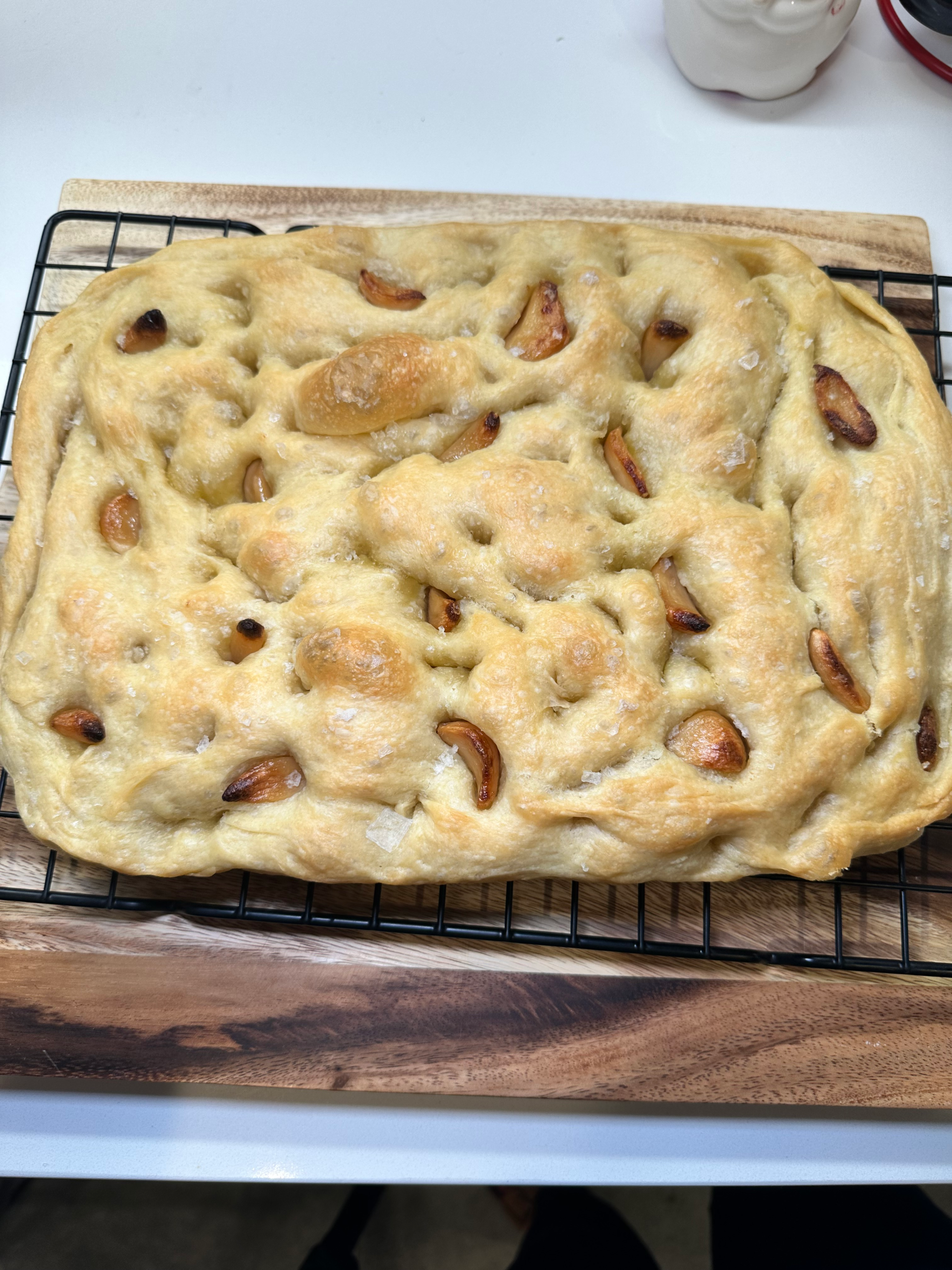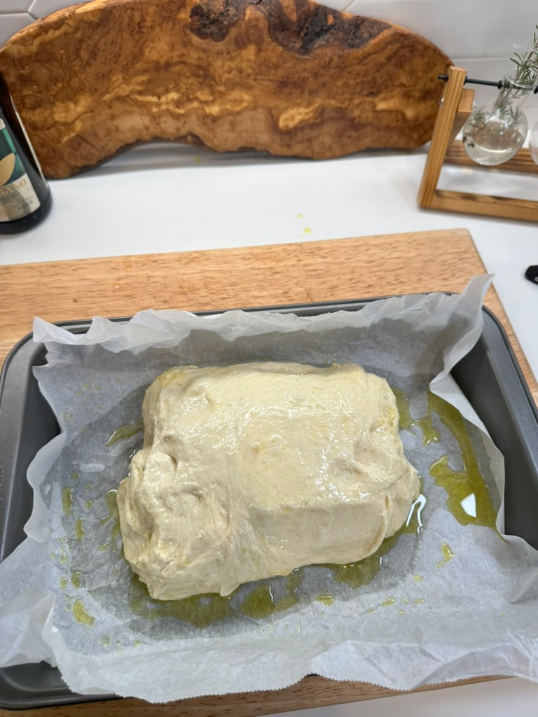 - Spoon a bit of garlic confit oil along with olive oil over the dough before dimpling