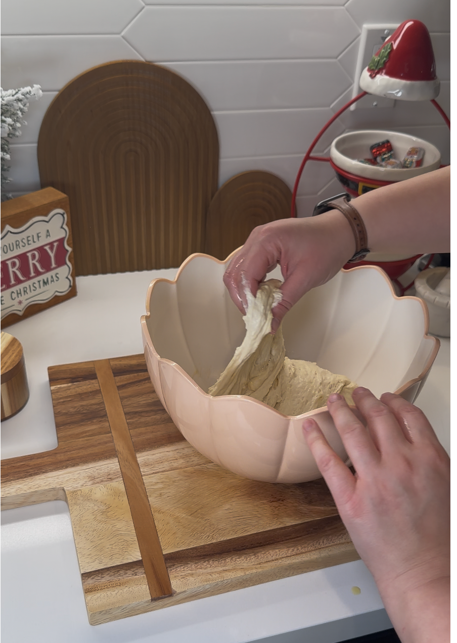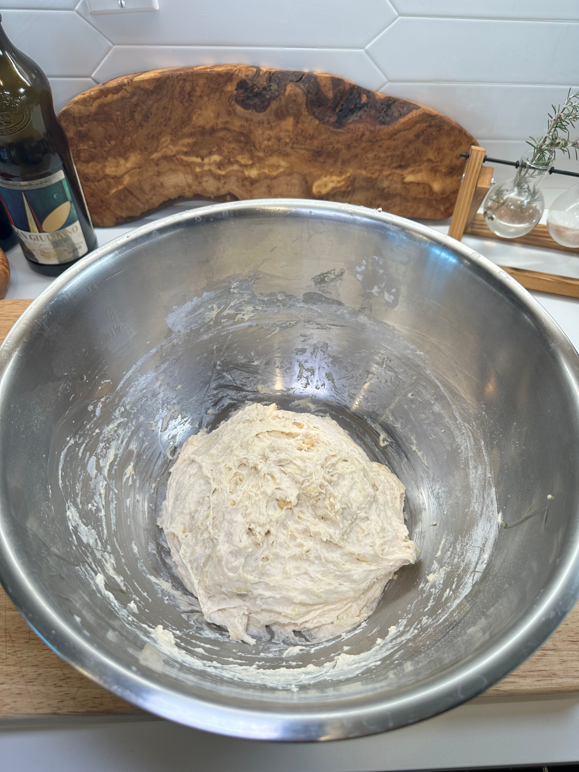 Take 4 sides and stretch and fold them over each other creating a ball. Cover and set aside for 15 minutes then repeat the stretch and folds one more time. Cover and place in a warm spot for about 1.5 hour, or until doubled.