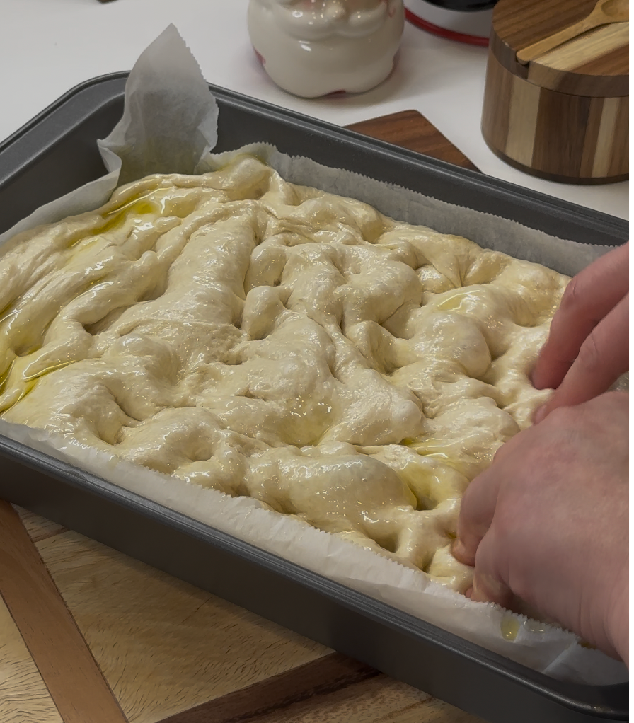 Gently stretch into a rectangle about 1 inch thick. Use your fingertips to press deep dimples all over.